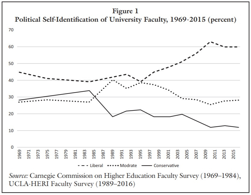 I find this fascinating, as there is plenty of empirical evidence confirming that, in fact, the academy, across faculty and administrators, and especially in particular departments, is dominated by the left and far left. For instance, Magness and Waugh, in an article published in The Independent Review, use the Carnegie Commission on Higher Education Faculty Survey and the UCLA-HERI Faculty Survey to show the trends from 1969 to 2015: